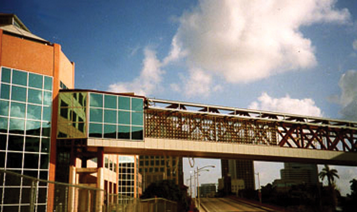 Three third-level connecting bridges ranging in length from 125 ft to 189 ft. One bridge is connecting the 2300-car garage and the East wing, and two other bridges connecting new and existing judicial complex buildings over Downtown Fort Lauderdale thorough fares.