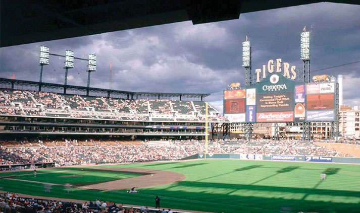 The Detroit Tiger’s new ballpark opened on April 11, 2000, and features the “World’s” largest free standing Scoreboard Structure that includes two towers supporting the left field sport lighting. In right field stands a 185 foot tall free-standing sport lighting tower. The playing field is located 28 feet below grade placing the Main Concourse at street level. The Main Concourse is framed with cast-in-place beams and one-way slabs and supports the structural steel, architecturally exposed stadium frame which “leans” towards the field. The stadium is supported on caissons.