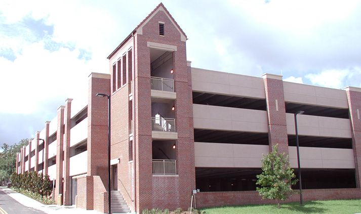 The 850 car parking structure has 4-level of parking at the perimeter and 3-level of scissors ramps parking at the middle section of the building. The facility employs pre-topped double tees precast floor system to offer a clean, aesthetically pleasing and functional structure, which requires minimal maintenance. Stair towers at the building corners utilize a clay brick exterior, and have steep double pitch roof slopes with gable ends. The parking structure is adjacent to Student Services Center, a BNI project.
