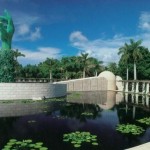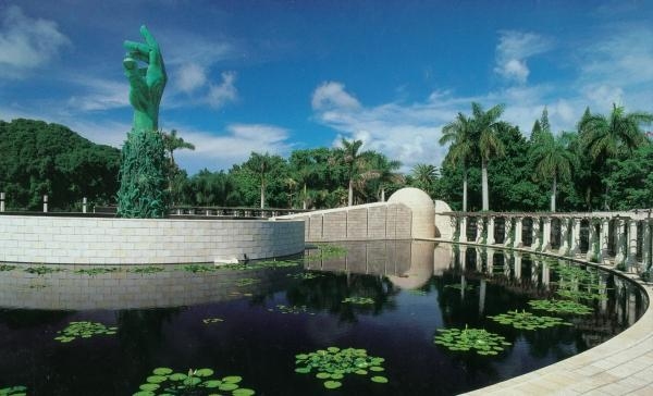 While some artists depict the Holocaust only in the dimensions of its horrors with concrete, metal and barbed wire, the artist broads the theme here to include a serene and peaceful garden. The garden is composed of a large plaza of Jerusalem stone, a 200-foot-diameter water lily pond, and a classic semicircular colonnade and arbor, all set against a backdrop of a dense green palm forest.