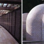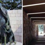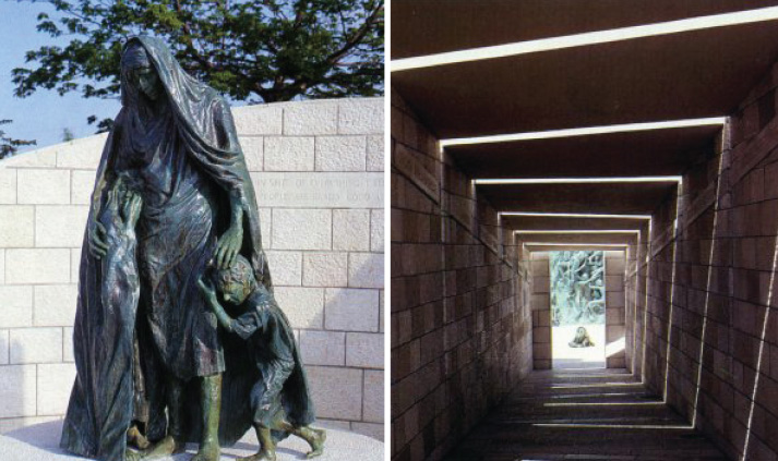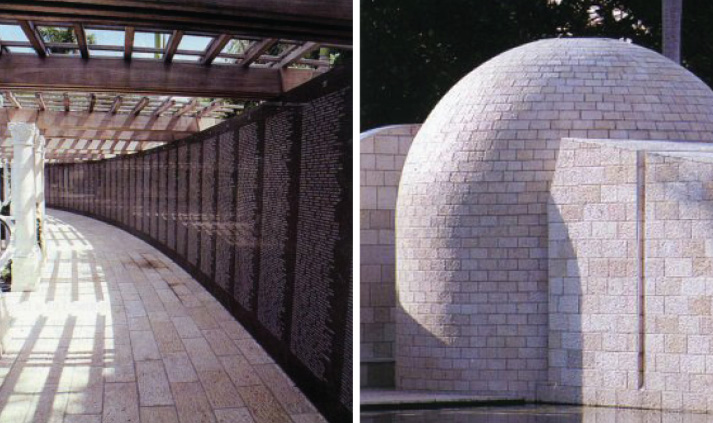 The Holocaust Museum begins with a semicircular colonnade of Jerusalem stone columns supporting a wooden arbor. Following the arbor is a series of black granite slabs etched with photographs of the tortured Holocaust history.