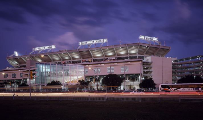 The 65,000 seat, 159 suite stadium for the Tampa Bay Buccaneers features an End Zone Plaza complete with pirate ship that fires its cannons each time the Buccaneers score. The plaza supports 5,000 additional seats, increasing the seating capacity to 75,000 seats for special events. The stadium is framed with all cast-in-place concrete and is